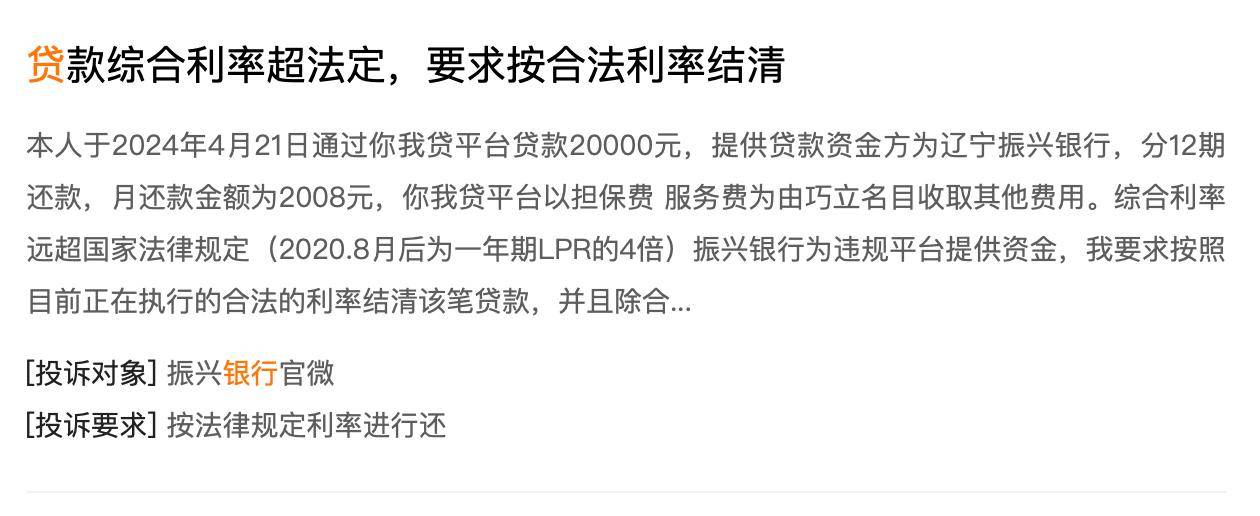 類似的案例並不少見,另一位黑貓投訴用户言2024年4月21日通過你我貸貸款20000元,資金方為遼寧振興銀行,分12期還款,月還款金額為2008元,你我貸平台以擔保費服務費為由巧立名目收取其他費用。