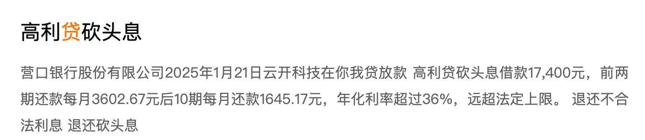 比如,有用户在黑貓投訴稱自己在你我貸借款17400元,前兩期每月還款3602.67元,後10期每月還款1645.17元,利率超過36%。