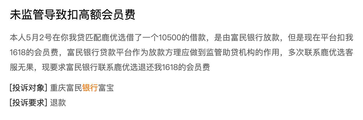 誠如某黑貓投訴用户所言,“5月2號其在你我貸匹配鹿優選借款10500元,由富民銀行放款,但是現在平台扣我1618的會員費,富民銀行貸款平台作為放款方理應做到監管助貸機構的作用……..”