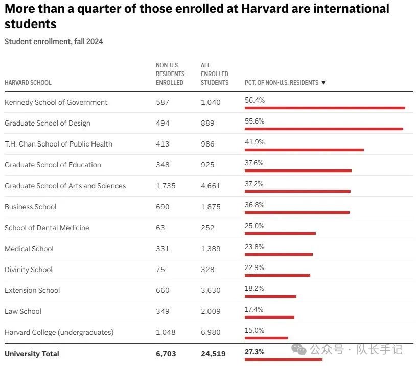 看看哈佛統計數據,在2024-2025學年,一共招收了近6800名國際學生,佔到入學總人數的27%。其中,中國留學生最多,達到了1016人,隨後是來自加拿大、印度、韓國、英國等150多個國家。