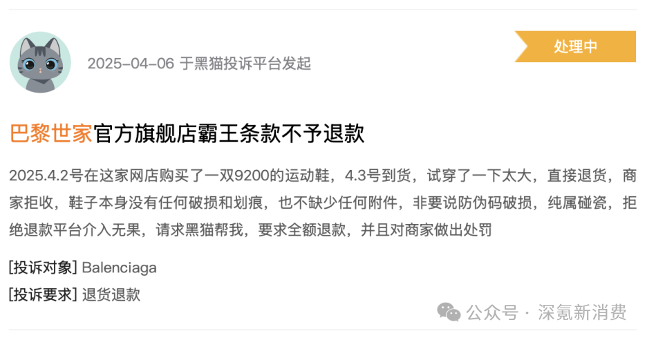 在黑貓投訴平台上,關於巴黎世家的投訴層出不窮,涉及產品質量、售後服務、虛假宣傳、強買強賣等多個方面。比如,有消費者稱,其在巴黎世家官方旗艦店購買了一雙價值9200元的運動鞋,因買回來試穿太大就直接退貨,在鞋子本身沒有任何破損和劃痕,也不缺少任何附件的情況下,商家拒收且拒絕退款。還有消費者表示,自己花費上萬元購買的巴黎世家衣服,洗了一次就出現了破洞。