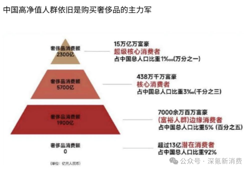 根據《中國奢侈品消費心理與行為分析》研究數據,億萬富豪貢獻了超過2300億的奢侈品銷售額,前0.3%的高淨值人羣購買了市場42%的奢侈品。根據人羣畫像,高奢鑑賞家佔9%,認同追求派佔40%,時尚弄潮者佔33%,新興嚐鮮黨佔18%。