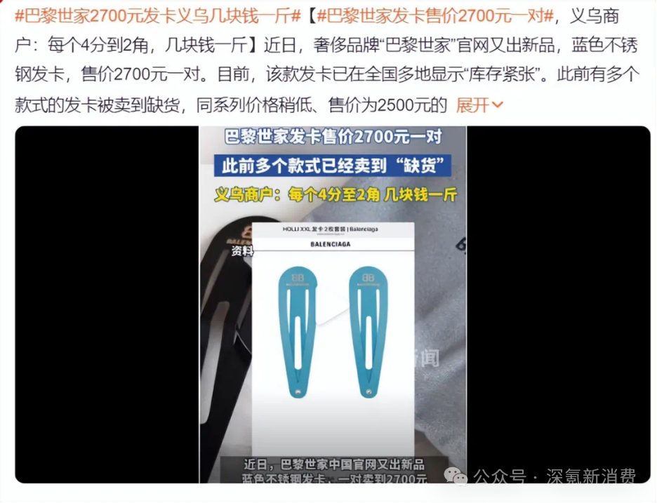 然而,當它披上巴黎世家的LOGO,身價便如同坐上火箭般飆升至2700元一對,價格漲幅超過2000倍。這種魔幻的定價策略,讓網友們紛紛調侃:“這哪裏是賣髮卡,分明是在挑戰消費者的心理防線。”