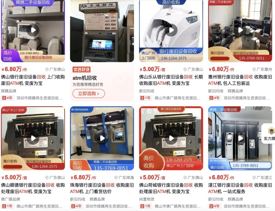 時代財經通過在百度旗下B2B平台“愛採購”搜索ATM機發現,銀行的報廢ATM機回收價在5萬元/台左右;不過,在“閒魚”等C2C二手交易平台,一台二手ATM機的價格則更低,僅為3000~5000元。