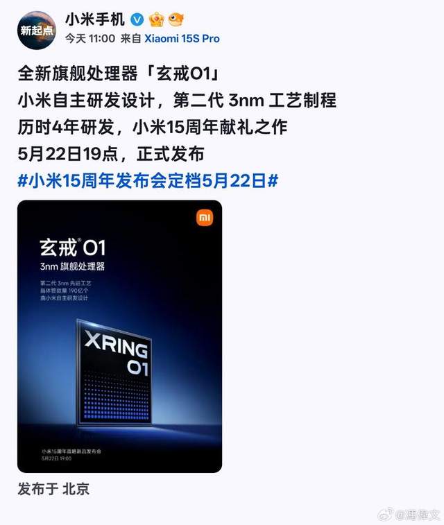 5月22日,小米15週年戰略新品發佈會上官宣,小米自主研發設計的3nm製程手機處理器芯片玄戒O1已開始大在規模量產。