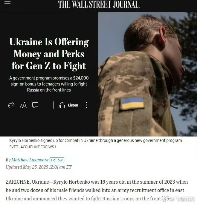 2025年5月25日《華爾街日報》寫道,烏克蘭武裝部隊的年輕人服役合同計劃失敗了:自 2 月以來,只有大約 500 人簽署了合同。許多人選擇移民。這個也説明烏克蘭普通民眾沒有相信烏克蘭軍隊只死了官方公佈的3萬的報道,而且目前自願參加的年輕男性人數非常之少。