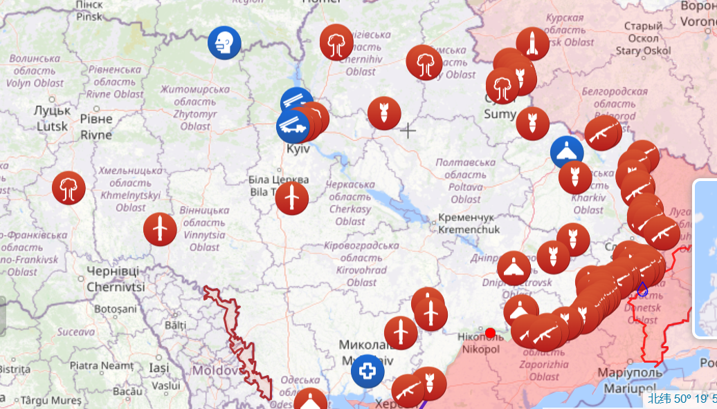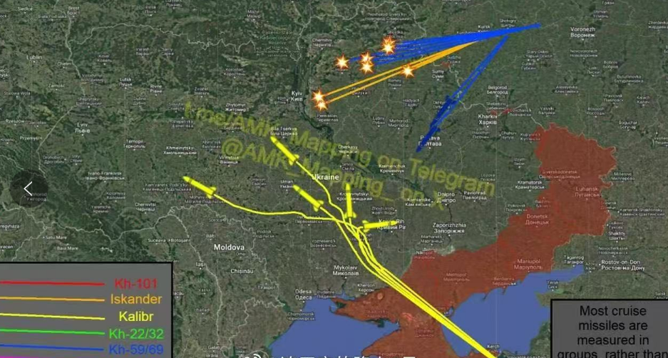 從昨天晚上開始,俄羅斯軍隊出動多架圖-95MS戰略轟炸機、圖-160戰略轟炸機、蘇-57戰機、多艘海軍艦艇(發射“口徑”巡航導彈)和“天竺葵”自殺式無人機對烏克蘭境內多個目標發動了新一輪大規模襲擊。目前已發射了Kh-101和Kh-69巡航導彈、“口徑”巡航導彈、“伊斯坎德爾-M”彈道導彈和“天竺葵”自殺式無人機。昨晚據俄羅斯國防部稱,美國愛國者防空系統和無線電技術情報中心的位置受到了打擊。