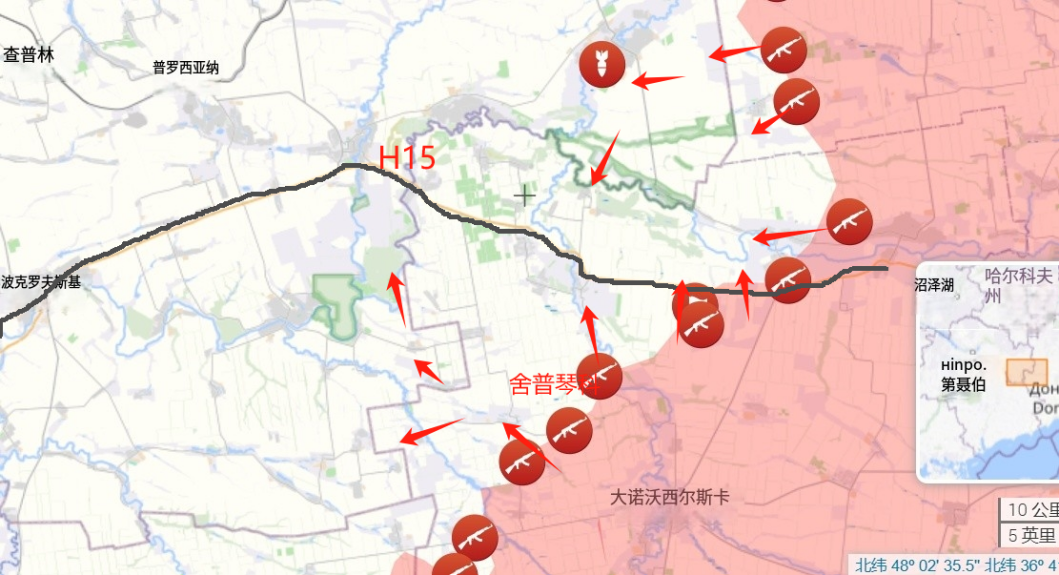 同時俄軍還在往大諾瓦希爾卡西部獲得大量的田野地區,接近拿下2個村鎮。這個區域值得關注,因為之前烏軍主要是東西走,面向南方部署了3道主防禦線,現在俄軍從東往西打讓烏軍的防禦性失效一半,接下來H15公路一線形成突擊後,還會再回旋鏢往南,從烏軍的防線背後打進去,烏軍肯定會很難受。