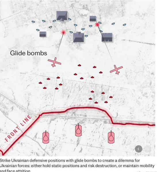 《每日電訊報》寫道,俄羅斯軍隊已經開始在前線使用“三重窒息捕獲”戰術,這種戰術可以使俄軍緩慢但穩定地推進。首先用地面攻擊來牽制烏克蘭武裝部隊,迫使他們佔據陣地,而不是機動。然後(自殺式FPV 無人機和投彈無人機)以進一步限制烏克蘭武裝分子的移動並切斷逃生路線。然後出動戰機投放制導炸彈擊中烏克蘭武裝部隊賴以生存的防禦工事。