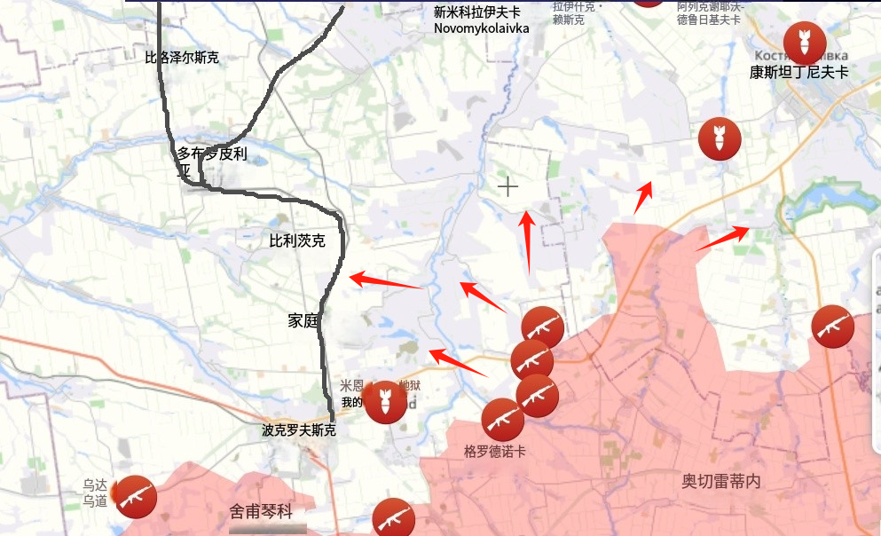 再往前,烏軍沒有比較的據點。由於紅軍城西部補給線無法補給,烏軍只能將物資中轉樞紐挪到了多布羅皮利亞,這個地方有2條鐵路回合,也有高速公路通過。目前看俄軍的主要目標也對準了這條補給線(黑色的線備註)。