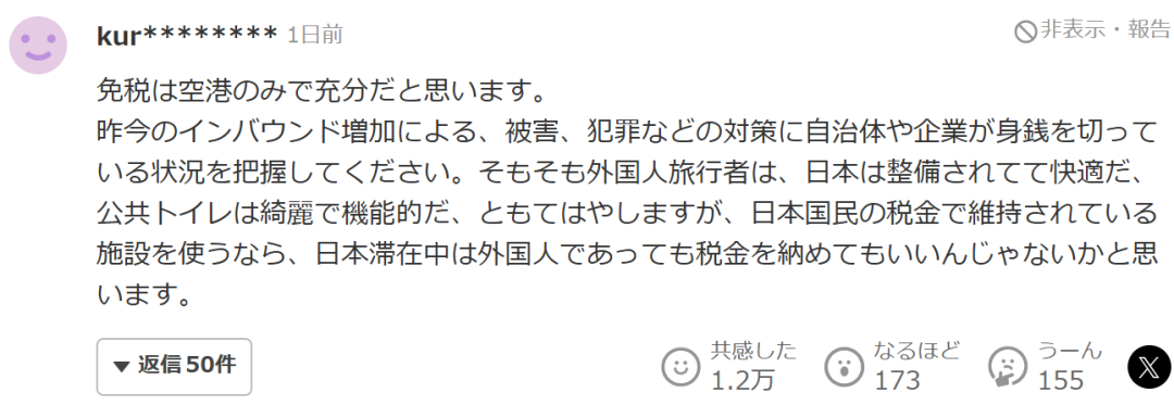 “免税只在機場就足夠了。請了解一下由於近年來訪日外國遊客增加所帶來的受害、犯罪等問題,使得地方自治體和企業不得不自掏腰包進行應對的現狀。本來外國遊客總是誇讚日本設施完善、舒適、公共廁所幹淨又功能齊全,但這些設施是用日本國民的税金維持的。既然在日本滯留期間要使用這些設施,我認為即便是外國人,也應該繳納税金。”