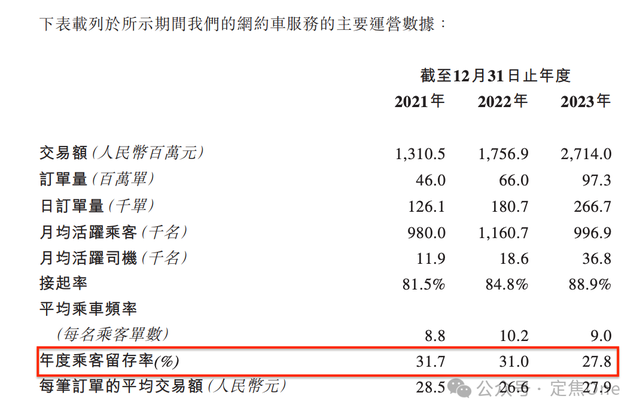 如祺出行在招股書中明確提到,因為第三方聚合平台的訂單量不斷增加,網約車服務的月活用户從2022年的116萬,下滑到2023年的99.7萬,用户留存率跌破28%。
