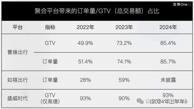 最典型的是曹操出行,2022年,它的總GTV(交易總額)為89億元,其中49.9%(約44億元)來自聚合平台,自有渠道貢獻剩餘50.1%(約45億元);到了2024年,總GTV增加到170億元,但85.4%來自聚合平台(約145億元),自有渠道佔比為14.6%(約25億元)。