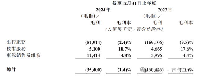 反觀如祺,2024年淨虧5.64億,未來還需要長期投入。從毛利情況看,技術服務和車隊銷售雖盈利(毛利率分別為18.7%、4.8%),但收入規模太小(合計2.6億);收入佔比9成的網約車毛利率為-2.4%,拖累了整體利潤。