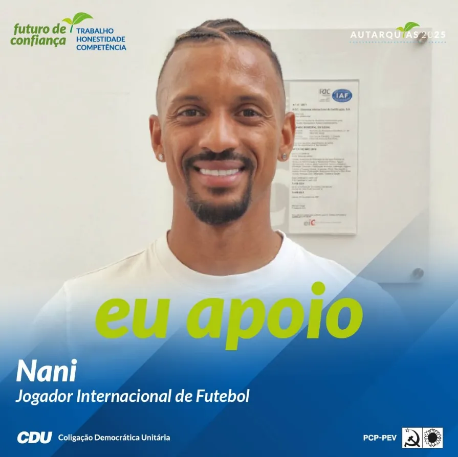 這兩天,有一張選舉海報在互聯網上廣為流傳。海報中的人物是已經退役的葡萄牙球星納尼,下面寫着葡萄牙語 eu apoio(我支持)。海報下方是兩個政黨的標誌,一個是葡萄牙共產黨的黨徽鐮刀錘子,另一個則是葡萄牙的綠黨“生態黨”的黨徽向日葵。