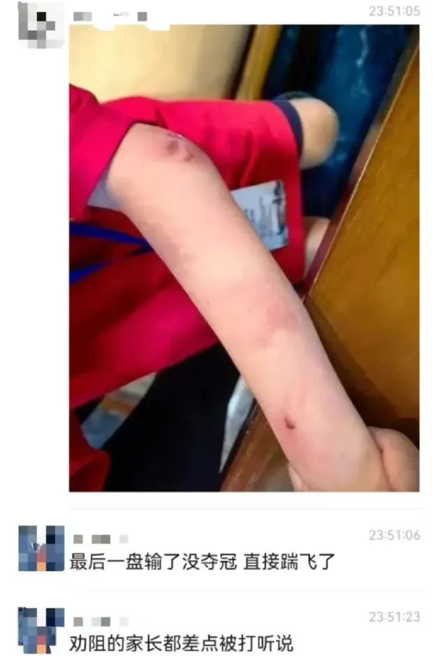 有其他家長上前勸阻,被鐵棍誤傷,腿腫了一個月。
