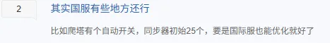 比不過再好玩的遊戲,也有缺點,比如很多玩家覺得上面這個玩法有些膩了,騰子考慮到這一點,為了能讓國服玩家擁有更好的體驗,大手一揮,在遊戲內做出了自動爬塔,自動戰鬥的功能。這直接讓玩家養成角色之類的省了不少事,能夠更好地“睡覺”了。還有人物的技能也給進行了大改,很多國際服的邊緣角色榮登T0級別,所以國際服上的那一套人物搭配之類的在國服不一定管用了,不過紅蓮還是爹就是了。