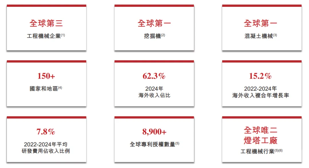 根據弗若斯特沙利文的資料,按2020年至2024年核心工程機械的累計收入計算,三一重工是全球第三大及中國最大的工程機械企業。於往績記錄期間,公司的產品已銷往全球150餘個國家和地區,2024年海外市場收入佔公司總收入的62.3%。