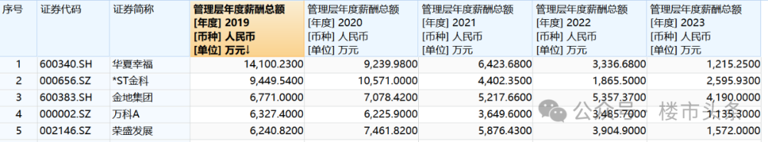 同樣是在2019-2023年間,據wind統計,金地集團管理層年度薪酬總額均位列A股wind房地產開發分類的TOP5。