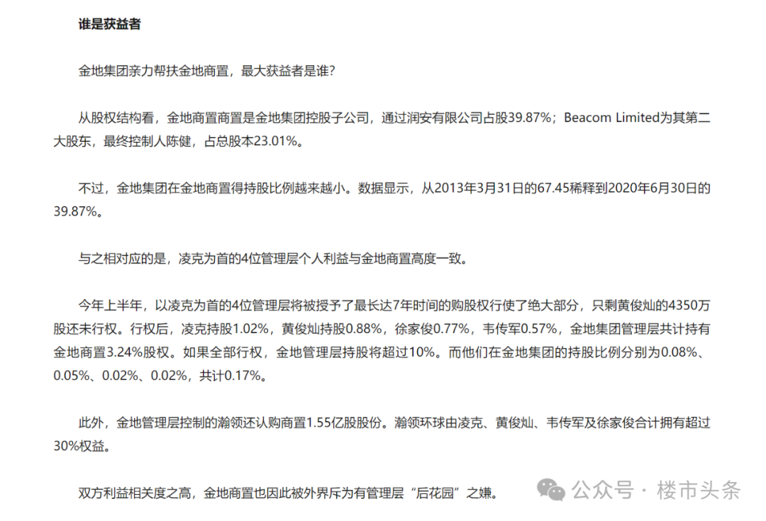 鳳凰網房產在2020年10月發出的一篇題為《金地“幹掉”金地》的文章中指出,金地集團親力幫扶金地商置,給錢給地給資源,最大的獲益者是以凌克為首的管理層團隊。