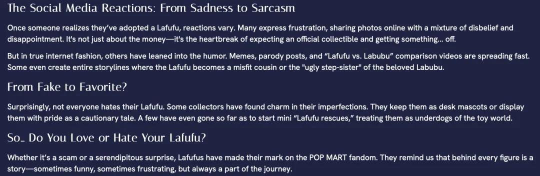 在一個由粉絲運營的“POPMART WORLD”網站上,博主撰文寫道:“並非每個人都討厭Lafufu。一些收藏家發現了它不完美中的魅力,把它們當作桌上的吉祥物,自豪地把它們作為警醒的故事展示出來;一些玩家甚至開始了一場迷你「lafufu救援行動」,把它們當作玩具世界的弱者(underdog)。”