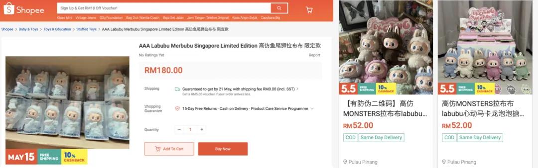 你甚至不用暗號,在Shopee上直接搜索高仿labubu便可找到大量假貨。比如新加坡限定的Merbubu,融合了新加坡吉祥物魚尾獅(Merlion)與Labubu的特點,是東南亞地區的搶手貨,也是高價假貨重災區。