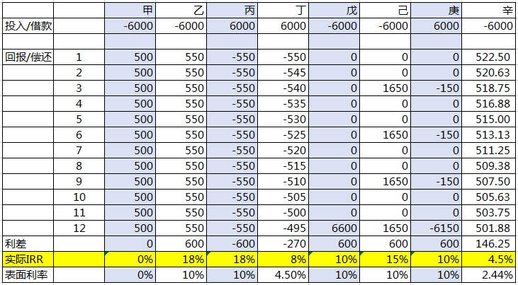 丁:借款6000元,每月償還金額遞減,一年後,6000元本金全部還完,多還金額為270,表面利率為4.5%,但IRR卻為8%。實際上利率也基本等於8%,遠大於銀行貸款的利息,這也是車貸等消費貸中經常能看到的套路,你以為利率只有4.5%,每月所還的錢也在逐漸減少,但實際上的利率是不能用利息總額直接除以本金總額的,要考慮到本金是否足額使用,是否按照使用的本金在計息。