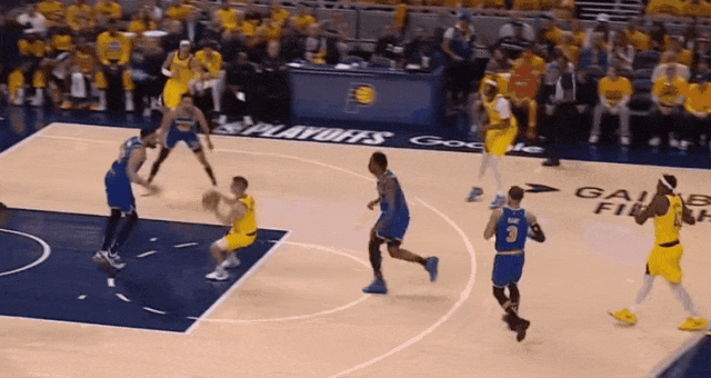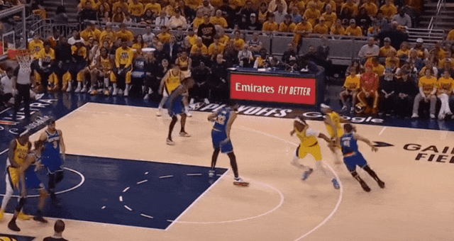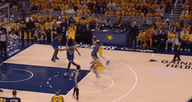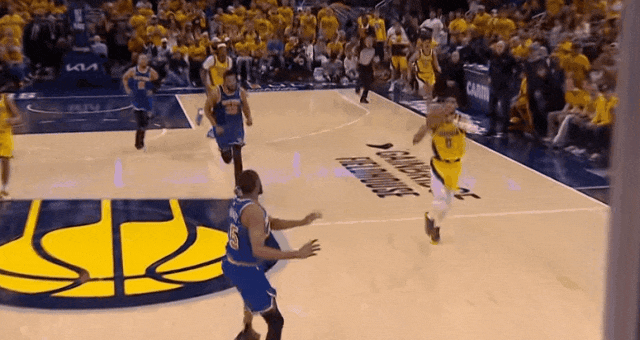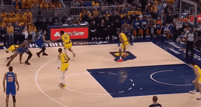 第一節後半,步行者擺出哈利伯頓+麥康內+謝帕德三後衞。