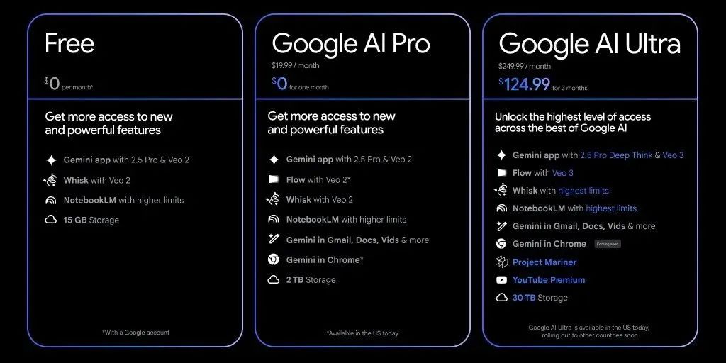 具體來看,谷歌推出了每月 249.99 美元的 AI Ultra 訂閲計劃,為追求極致體驗的用户提供最高權限的模型訪問(如Veo 3、Deep Think模式)、30TB雲存儲及優先體驗權。