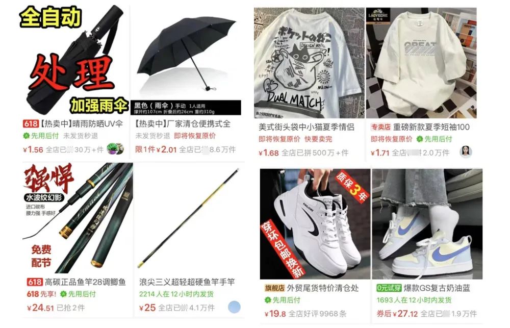 在某多多上,你花一兩塊錢能從河北老闆那兒買一把雨傘或者一件T恤,一二十塊錢就能買到一雙運動鞋甚至是碳素魚竿。