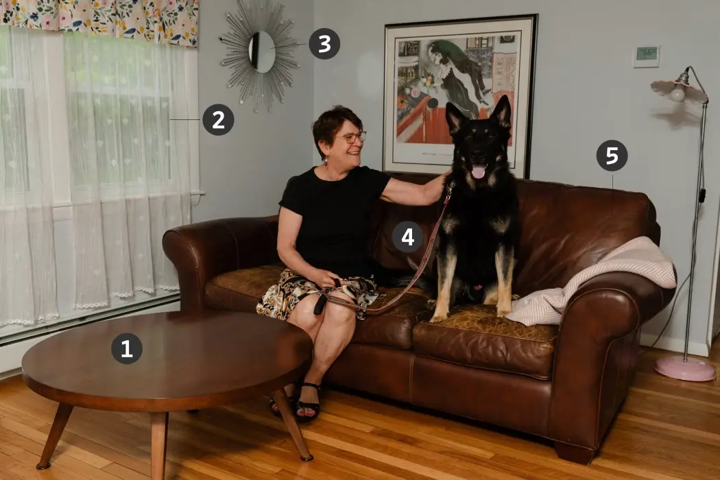 黛安娜·哈夫 (Dianna Huff) 和她的狗坐在沙發上。