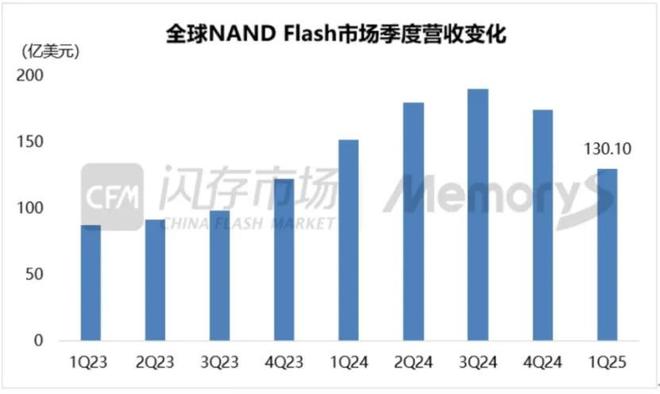 根據CFM閃存市場數據顯示,量價齊跌令NAND Flash市場規模連續兩個季度下滑,2025年一季度全球NAND Flash市場規模環比和同比均發生下滑,僅為130.1億美元,為五個季度以來的最低水平,環比減少25.3%,同比減少14.2%。