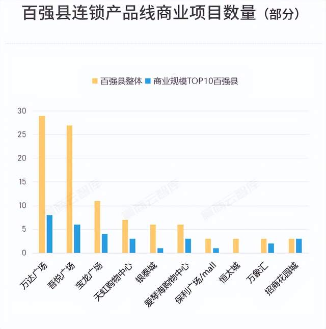 目前,萬達廣場可以稱得上是下沉市場中佈局最廣的商業體。據贏商網統計,截至2024年年中,萬達廣場在全國百強縣佈局了近30個項目,數量絕對第一;主打下沉市場的吾悦廣場排在第二,在百強縣佈局項目數量超過25個。