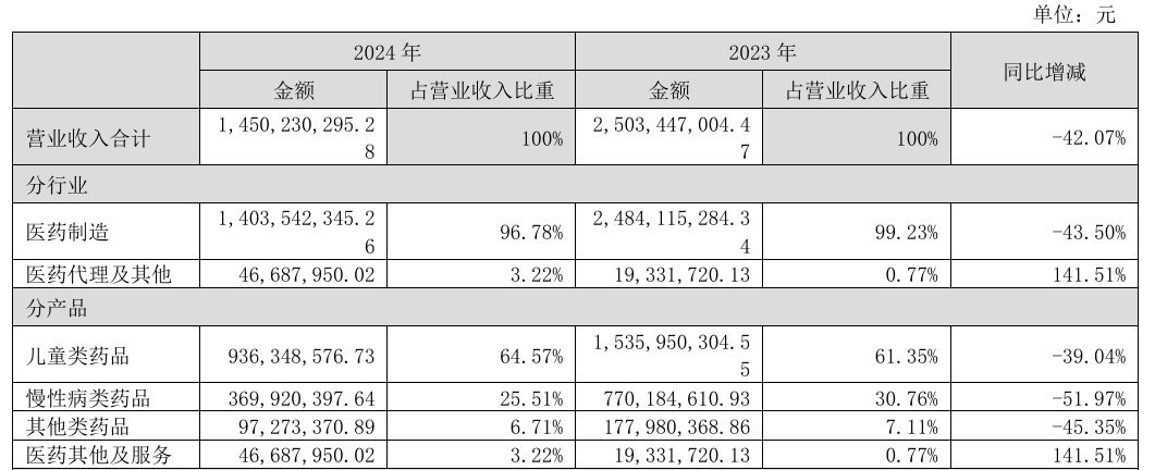 第一,主營業務發展日漸乏力。財報顯示,2024年,一品紅兒童類藥品實現收入9.36億元,同比下降39.04%,佔總營收的比重達到64.57%;慢性病類藥品實現收入3.7億元,同比下降51.97%,佔總營收的比重達到25.51%。