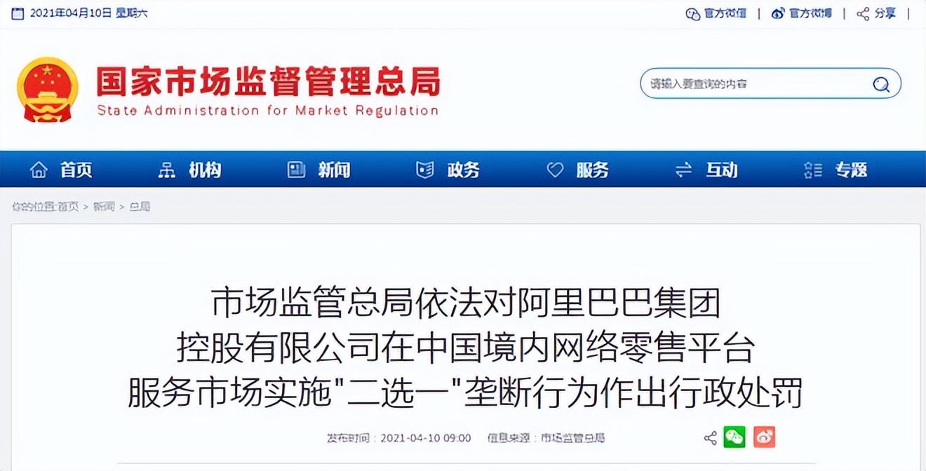 2021年4月10日,國家市場監管總局發佈對阿里巴巴集團控股有限公司在中國境內網絡零售平台服務市場實施"二選一"壟斷行為的行政處罰,責令阿里巴巴集團停止違法行為,並處以其2019年中國境內銷售額4557.12億元4%的罰款,計182.28億元。
