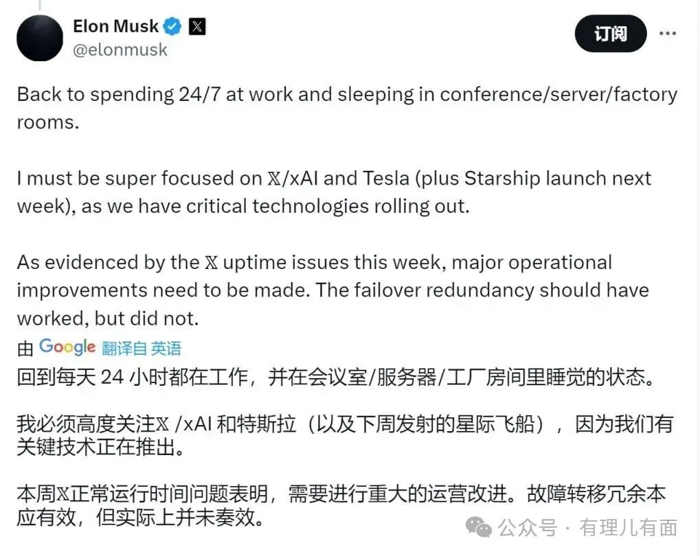 當地時間5月24日,馬斯克在社交媒體X平台發文稱,他將回到自己的公司,開始每天24小時的工作,以關注他的X、xAI、特斯拉和星際飛船。