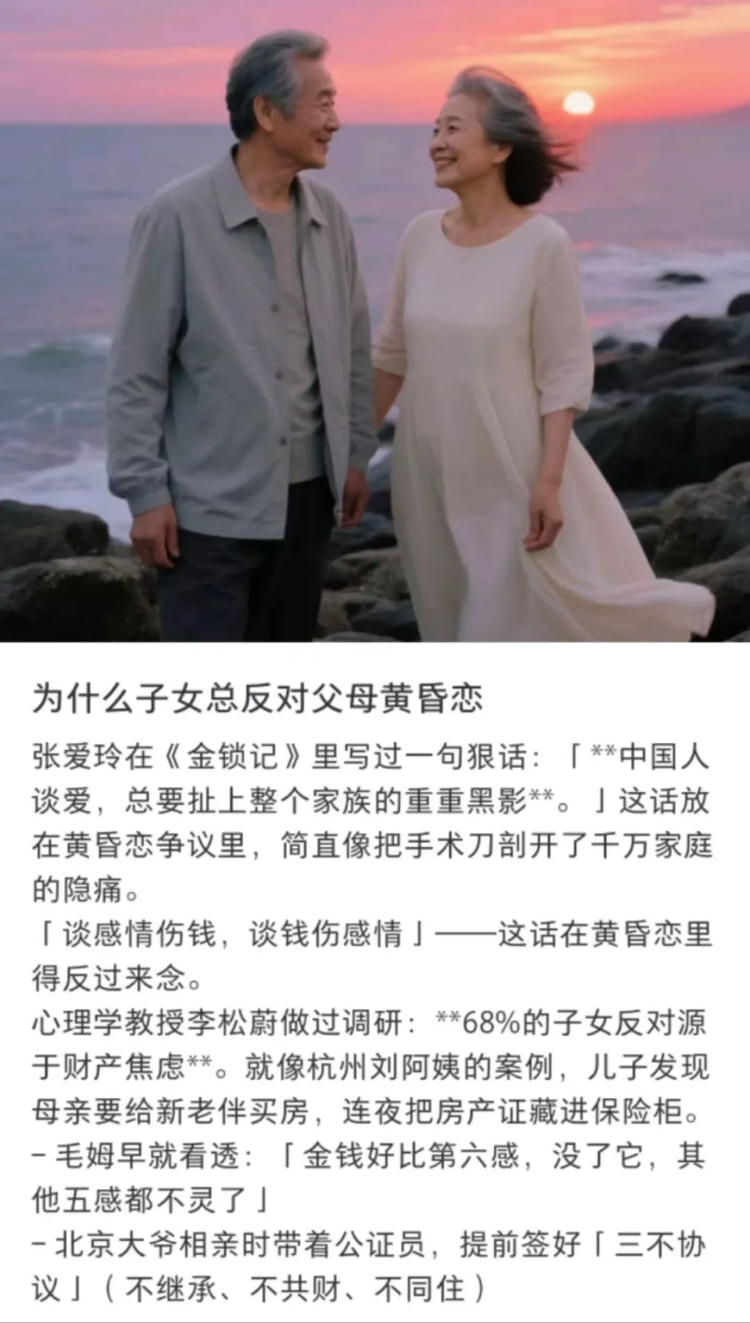 “我爸要是敢把房子轉給別人,我們一家都不認他。”這類“預警式發言”,早已成為不少家庭羣裏的高頻句型。一些原本在認真交往的老人,就因為子女強勢干預,被生生勸退,感情也就不了了之。