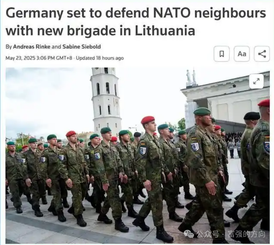 據報道,德軍於22日正式進駐立陶宛。德國總理默茨和立陶宛總統瑙塞達當天出席了該部隊的進駐儀式。這是自二戰結束後德國首次向海外部署大型常駐軍隊。