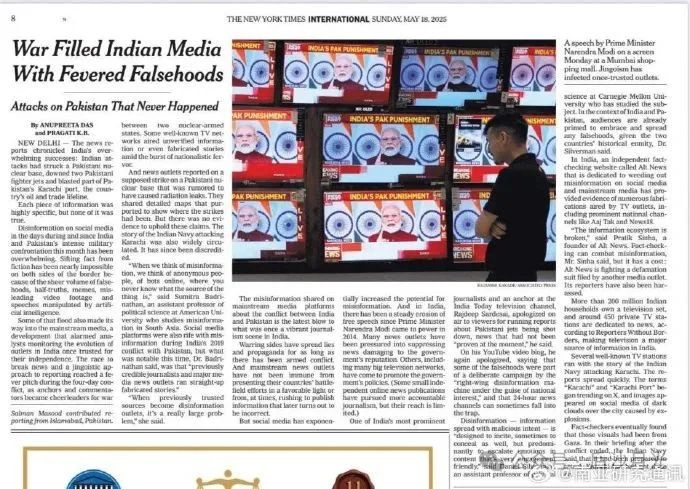 5月17日,《紐約時報》用整版重錘印度造謠,《戰爭讓印度媒體充斥着狂熱的謊言!》