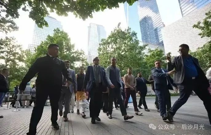 他們先去了紐約,裝出一副威風凜凜的樣子來到9111紀念館,這鏡頭還是仰拍的,有氣勢。