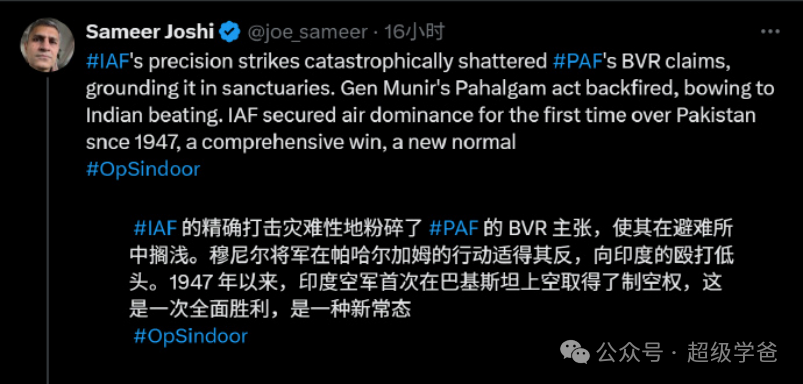 下面這位就是一個典型。他認為印軍吊打了巴基斯坦軍隊,迫使巴方向印度低頭。這次勝利,是印度1947年建國以來第一次在巴方上空取得制空權,是扭轉局勢的大勝特勝。