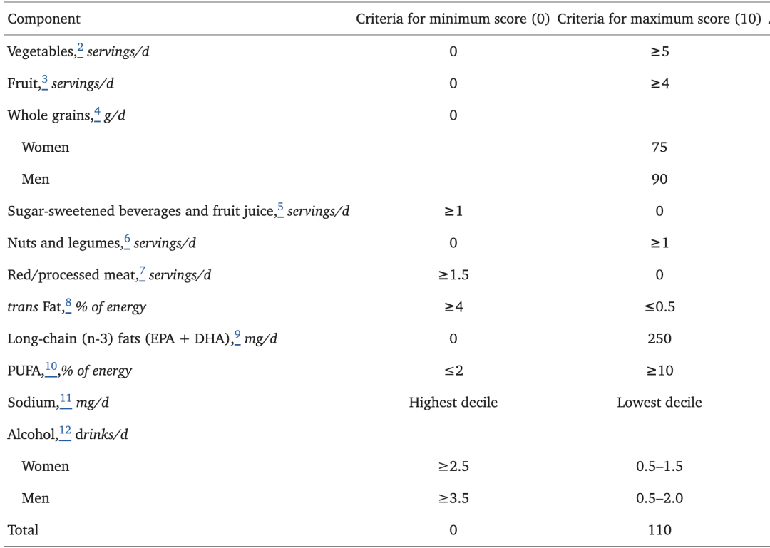 這個評分工具一共包括11個關鍵食物和成分。根據飲食中這些食物、成分食物的攝入情況打分,0-10分 ,總分110分,總分越高代表越健康[4]。