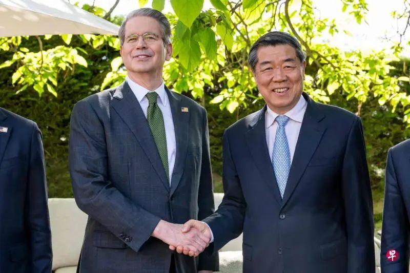 5月11日,在日內瓦出席貿易談判的美國財政部長貝森特和中國副總理何立峯握手(圖源:法新社/《聯合早報》發)