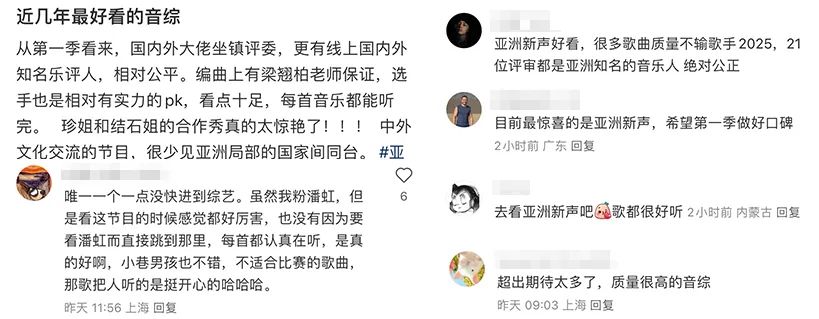 尤其是《亞洲新聲》這檔節目,在音綜紛紛打熟臉安全牌的時候,大膽啓用以00後為代表的新生代歌手,更通過打造跨國舞台將音綜範圍首次擴至全亞洲,讓多個國家和地區的年輕歌手上桌,推動新生代音樂力量的成長和亞洲音樂文化的多元融合。播出以來,節目不僅迅速“硬控”了年輕觀眾,也有望通過創新模式與高質量內容,成為2025年音綜市場的“破局”之作。