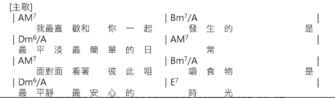 接下來的副歌段落,則在一開始採用了標準的七和絃432(5)1的編配手法,完美的把旋律所營造的熟悉感展現了出來,如同細膩的筆觸塗抹出戀人纏綿般的畫卷。