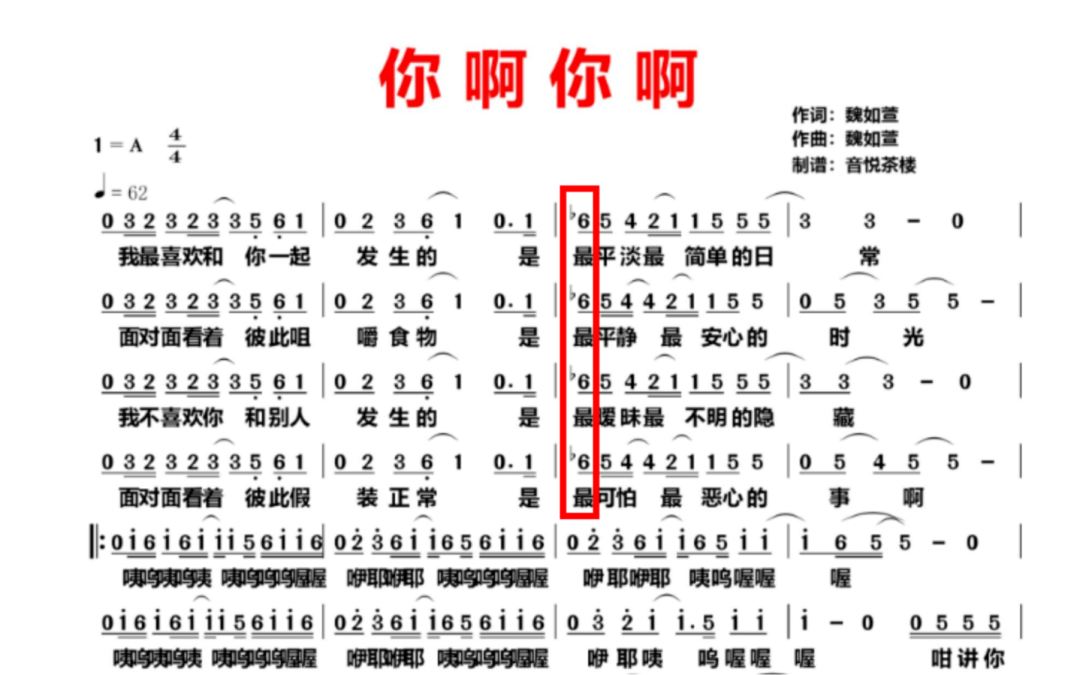 《你啊你啊》的主旋律是一條典型的抒情型旋律,節奏較為平穩。