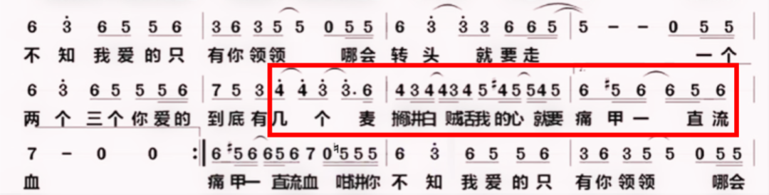 比如,在主歌中,反覆重複的“最”字就是一個重音,它的b6這個離調音意味着它是整個樂句中最高的音,也是第一個真正落在強拍上的音。