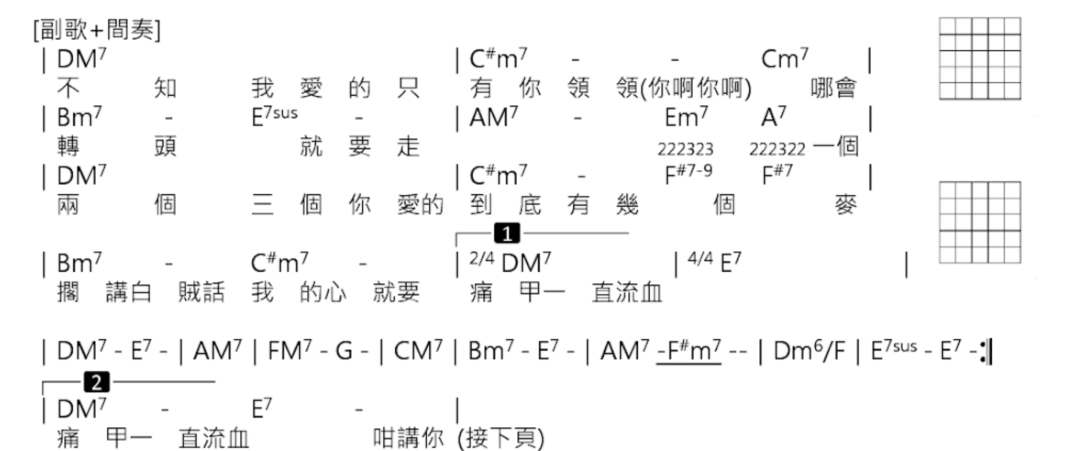 而後面的部分,在C#m7,F#7-9,Bm7作為臨時2-5-1的華麗離調後,轉而走向了上行,綿密的樂句配合非常非常直白的閩南語歌詞,傾訴感呼之欲出: