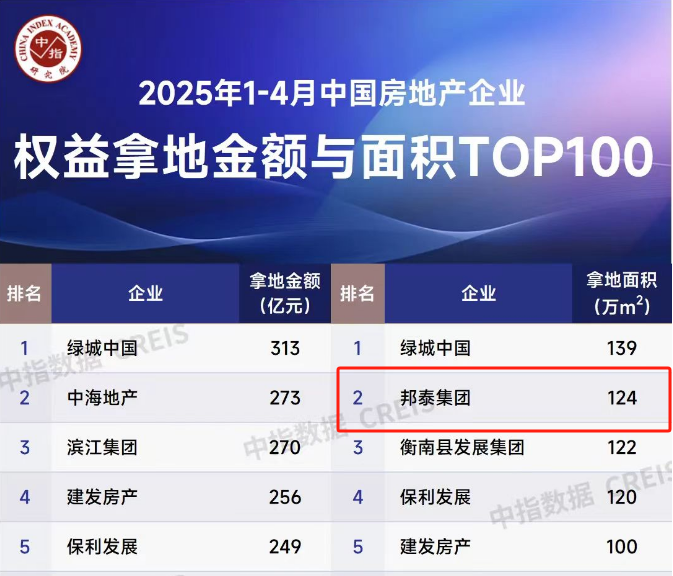 單説拿地面積,前四月邦泰集團拿地124萬㎡,僅次於綠城中國,排名全國房企第二。