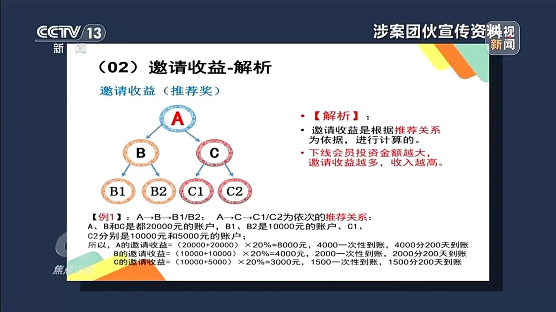 疑點重重,石棉縣出入境管理大隊立即把這位農民説的禾元農場App上報核查。經過調查,在這個“雲養殖”的App裏,對投資人的動態收益,設置了“推薦獎勵”“團隊提成”機制,投資者推薦一個新投資人進來,平台會根據新人投資金額按照一定比例直接返利給推薦人;推薦人的上線則通過團隊計酬的方式間接收益,發展的人越多,收益越多。這種靠拉人頭層層受益的計酬模式是傳銷組織的典型特點,也是一種新型的網絡傳銷。
